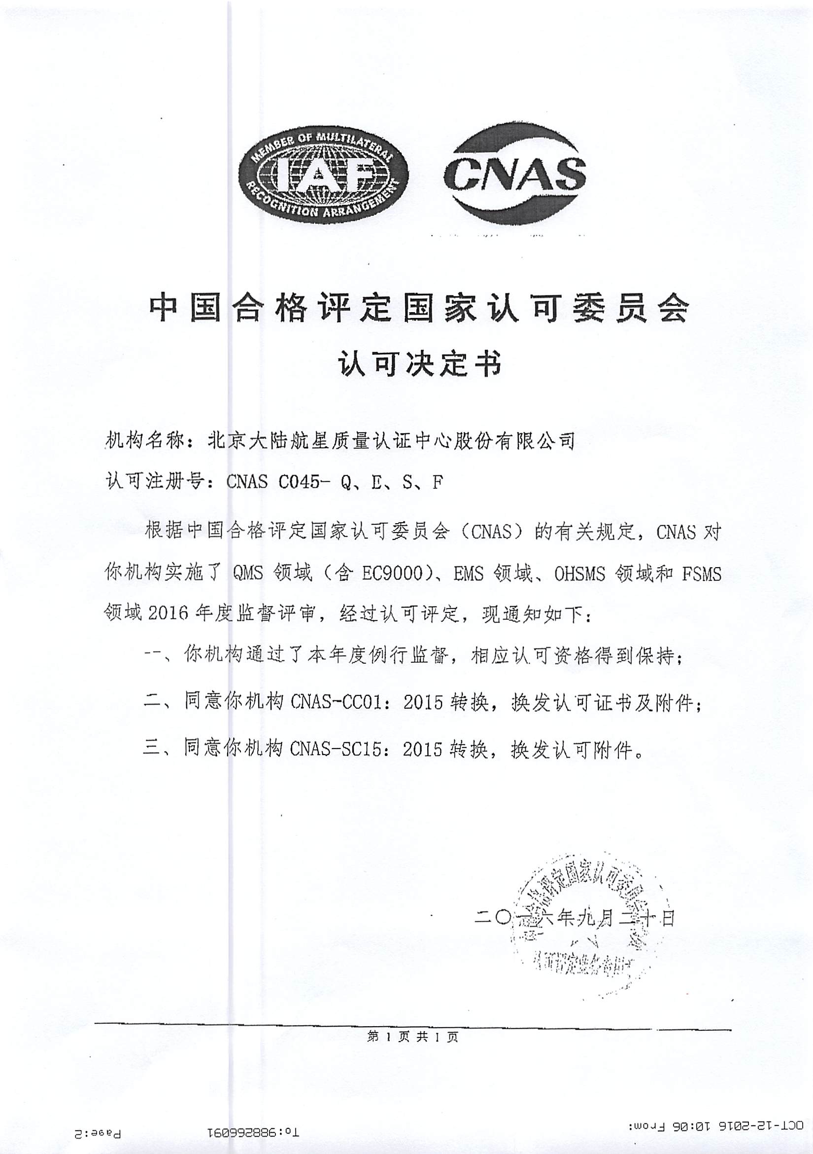 在管理層團(tuán)隊(duì)的引領(lǐng)下,經(jīng)總部各部門、各分支機(jī)構(gòu)及相關(guān)人員的共同努力,北京大陸航星質(zhì)量認(rèn)證中心股份有限公司(以下簡稱HXQC),順利通過中國合格評(píng)定國家認(rèn)可委員會(huì)(CNAS),對(duì)我公司進(jìn)行的例行監(jiān)督、轉(zhuǎn)換及擴(kuò)大評(píng)審。保持了QMS(含EC9000)、EMS、OHSMS和FSMS認(rèn)證領(lǐng)域的認(rèn)可資格,并通過了CNAS-CC01:2015和CNAS-SC15:2015轉(zhuǎn)換評(píng)審,同時(shí)擴(kuò)大了我公司QMS(含EC9000)認(rèn)證領(lǐng)域南通分公司、杭州分公司、青山分公司、武漢分公司和天津分公司5個(gè)關(guān)鍵場所。