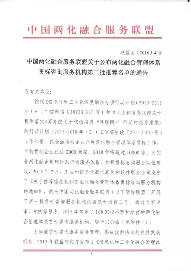 2015年8月,北京大陸航星質量認證中心股份有限公司(HXQC)向國家工業(yè)化和信息化部提交兩化融合管理體系貫標咨詢機構的申請,經(jīng)過半年審核獲得批準。