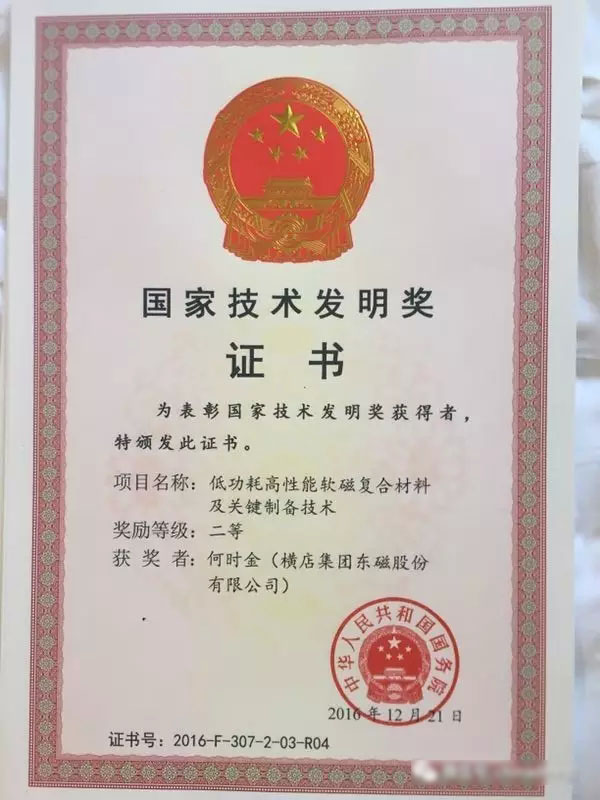19號,北京大陸航星質(zhì)量認(rèn)證中心股份有限公司客戶橫店集團(tuán)東磁股份有限公司董事長何時金與浙江大學(xué)團(tuán)隊共同發(fā)明的“低功耗高性能軟磁復(fù)合材料及關(guān)鍵制備技術(shù)”,在人民大會堂舉行的一年一度國家科學(xué)技術(shù)獎勵大會上獲得國家技術(shù)發(fā)明獎二等獎,受到表彰。
