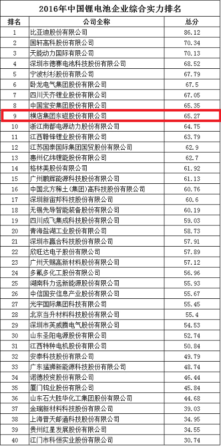 近日,新華網(wǎng)聯(lián)合唐宋大數(shù)據(jù)產(chǎn)業(yè)股份有限公司在北京發(fā)布的《2016年中國(guó)鋰電池企業(yè)綜合實(shí)力排名》榜單,對(duì)國(guó)內(nèi)主要鋰電池企業(yè)的綜合實(shí)力進(jìn)行排名。于去年底開始組織實(shí)施鋰離子動(dòng)力電池項(xiàng)目的橫店集團(tuán)東磁股份有限公司,以其強(qiáng)大的實(shí)力和發(fā)展速度,強(qiáng)勢(shì)進(jìn)入中國(guó)鋰電池企業(yè)前十榜單,位列第九。